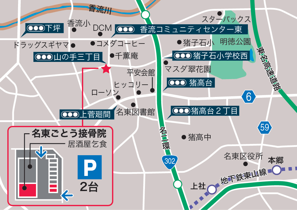 名東ごとう接骨院(旧接骨院三幸堂)は、名東区赤松台213番地にあります。最寄りのバス停は「文教台一丁目」で、そこから徒歩1分。周辺には「居酒屋乞食」さんや「カーマホームセンター香流店」さん、「ひだまりクリニック」さんなどがあり、分かりやすい立地です。